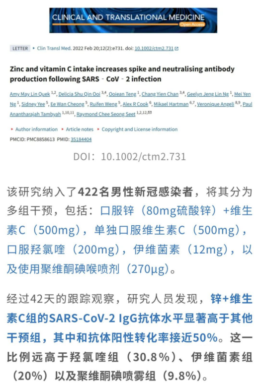 其中,一项由新加坡国立大学团队发表在Clinical and Translational Medicine的研究[2]发现,新冠感染后,同时服用维生素C+锌,可以让“阳康”患者尽可能提升中和抗体水平,减少重复感染几率。