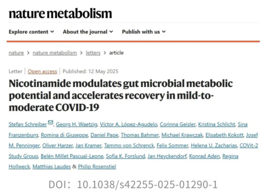 [1]Schreiber, S., Waetzig, G.H., López-Agudelo, V.A.et al. Nicotinamide modulates gut microbial metabolic potential and accelerates recovery in mild-to-moderate COVID-19. Nat Metab (2025). //doi.org/10.1038/s42255-025-01290-1