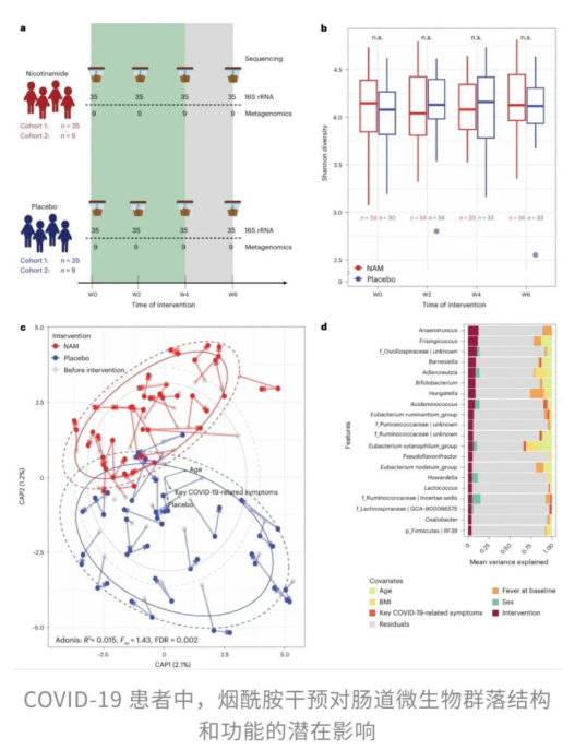 接下来,研究人员把目光投向了一个看似不起眼、实则至关重要的战场——肠道。我们的肠道里藏着一支庞大而精密的“微生物部队”,它们不仅负责消化吸收、合成营养物质,还深度参与着免疫反应与代谢调节。于是,研究团队从70位新冠患者身上采集了280份粪便样本,并从中挑选出18位进行了更深入的宏基因组分析,希望看看:烟酰胺是否能帮助这支“部队”恢复秩序、重整旗鼓?