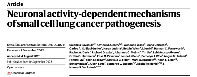 [1]Savchuk, S., Gentry, K.M., Wang, W. et al. Neuronal activity-dependent mechanisms of small cell lung cancer pathogenesis. Nature (2025). doi:10.1038/s41586-025-09492-z