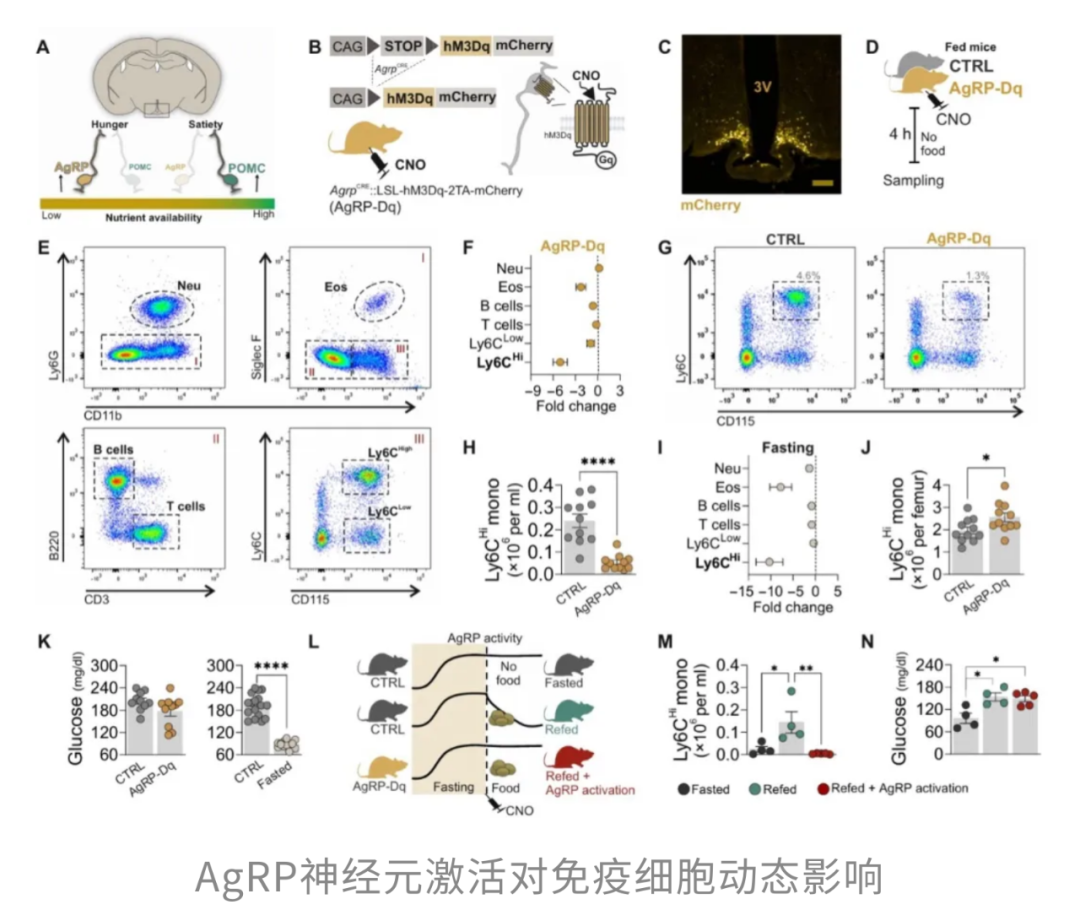 为了破解这个谜团,他们决定直捣“中枢”,目标是下丘脑中的AgRP神经元,也就是大脑中“饥饿感”的主要制造者。当研究者通过化学遗传学手段激活这些神经元,令小鼠产生“假性饥饿”时,短短4小时内,小鼠血液中Ly6CHi单核细胞数量便显著下降。