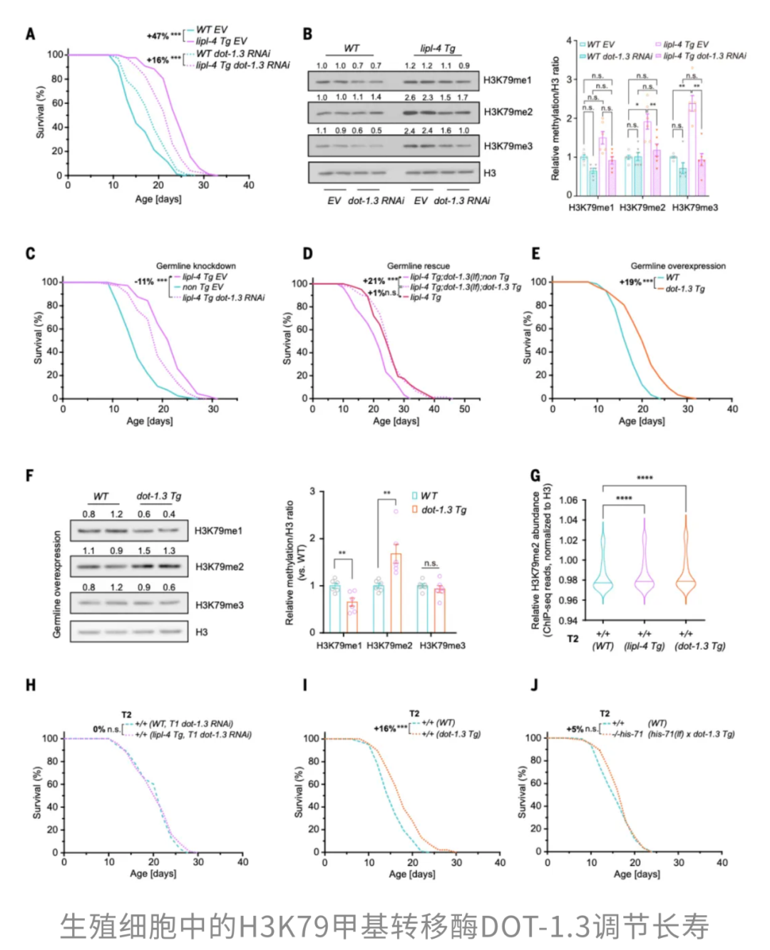然而,光是把H3.3运送到生殖系还不够,它还需要被打上关键的“甲基化印记”。这一任务由名为DOT-1.3的甲基转移酶完成。它专门在生殖系中表达,为H3.3的K79位点添加甲基标签。当DOT-1.3被敲除时,LIPL-4带来的延寿效应立刻减弱,H3K79的甲基化水平也明显下降;而只要在生殖系中恢复DOT-1.3的表达,寿命延长就能完全恢复。