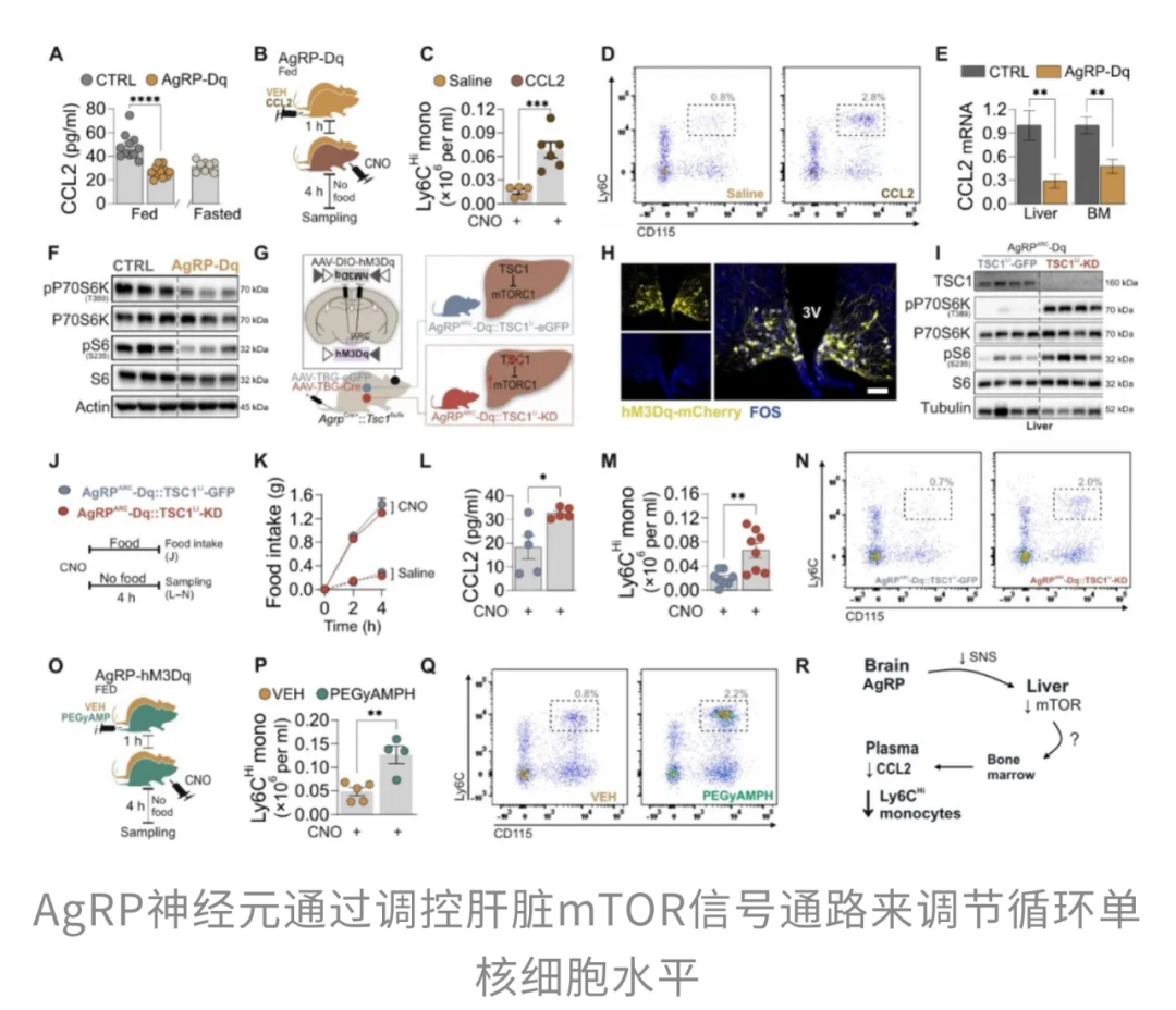 那么,深藏于颅内的AgRP神经元,究竟是如何“远程操控”外周免疫系统的呢?研究团队进一步追踪信号通路,发现这些神经元通过交感神经系统与肝脏进行沟通。当AgRP神经元被激活时,它们通过交感神经抑制肝脏的mTOR信号通路,从而减少趋化因子CCL2的分泌。CCL2是招募Ly6CHi单核细胞的重要信号分子,当它的水平下降时,这些免疫细胞的数量也随之减少,免疫反应因而被调节。