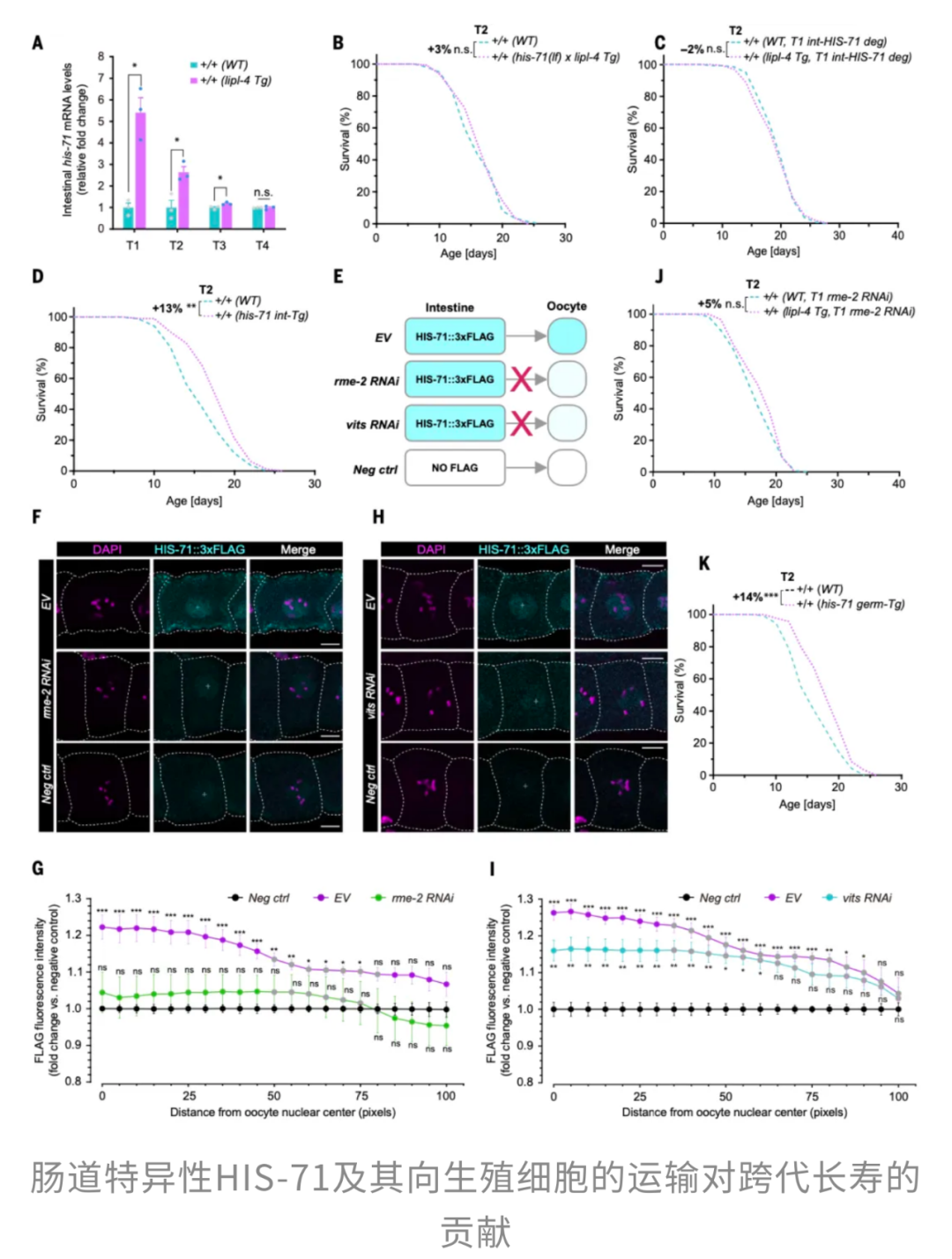 由此,一个精妙的跨组织信号链条被揭示出来:肠道首先感知代谢信号,并产生HIS-71;HIS-71借助卵黄蛋白“搭便车”进入生殖系;在生殖系中,DOT-1.3为HIS-71打上H3K79甲基化的“长寿印记”。这种印记随生殖细胞传递给下一代,从而实现寿命的跨代延长。