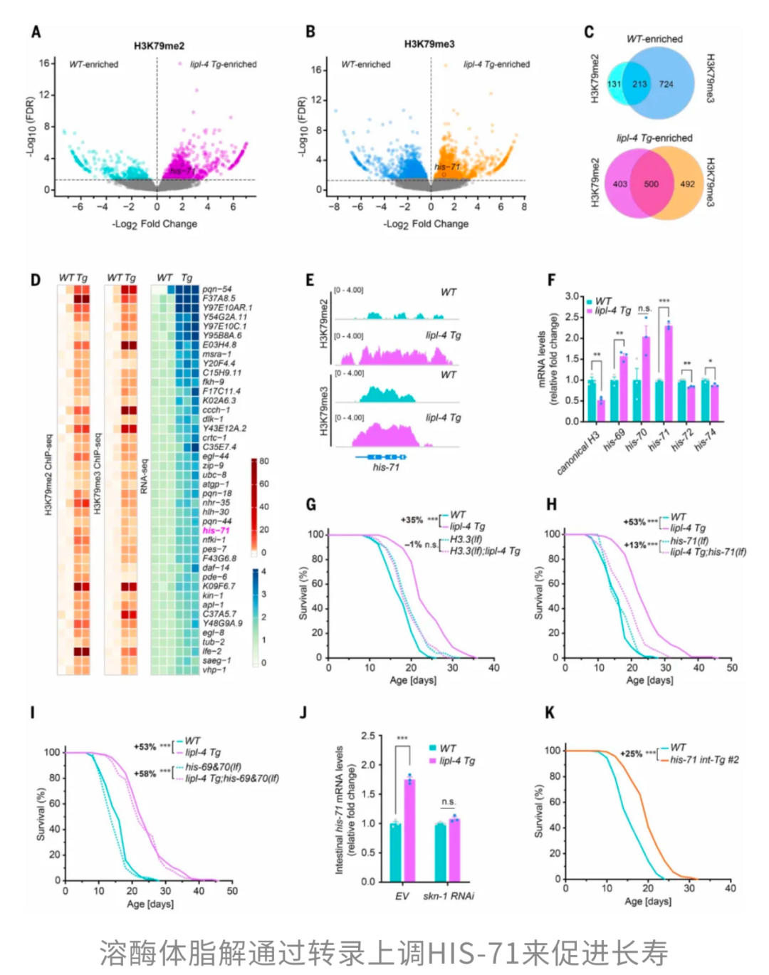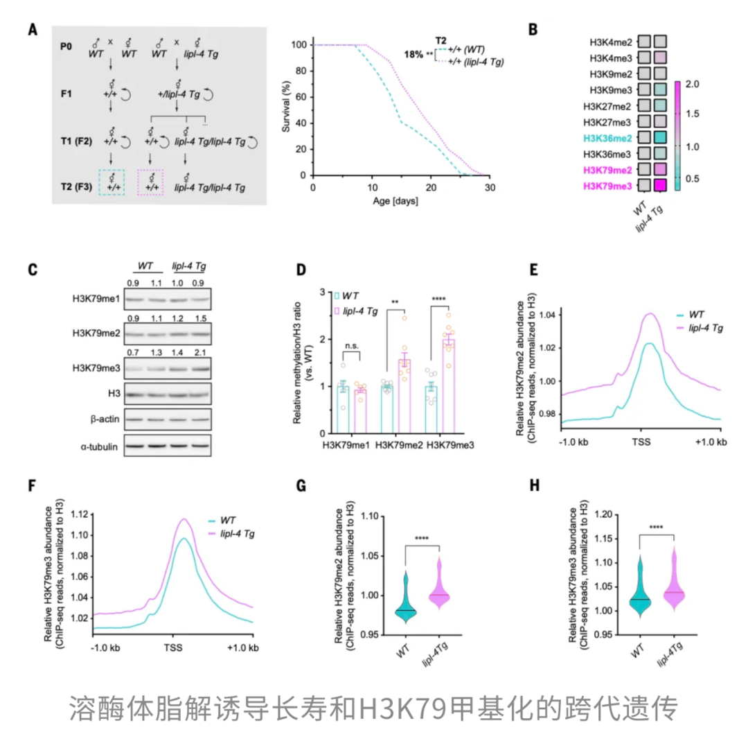 而且在自然条件下,这一机制也会被“饥饿”激活——当线虫在幼虫期经历6天的饥饿后,它们成年后的寿命平均延长19%。如果his-71或dot-1.3缺失,这种“饥饿加成”立刻消失。可见,饥饿本身就是触发LIPL-4表达、“点燃”HIS-71和H3K79甲基化的天然信号。