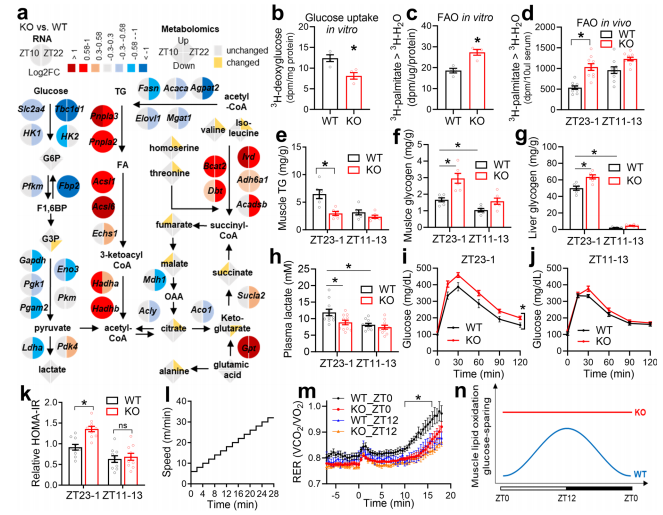 来自敲除小鼠的原代肌管表现出更低的葡萄糖摄取率和更高的脂肪酸氧化速率(下图b, c)。在活体运动中,敲除小鼠也显示出更强的整体脂肪酸氧化能力,尤其是在睡眠周期开始前(下图d)。