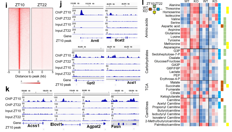 与此同时,染色质免疫共沉淀测序(ChIP-seq)数据显示,Rev-erb蛋白在ZT10(其表达峰值附近)会结合到大量靶基因的启动子区域,直接抑制与脂代谢相关基因的转录(下图f-k)。代谢组学分析为此提供了更坚实的证据:在Rev-MKO小鼠的肌肉中,脂肪酸代谢中间产物和肉碱水平升高,而糖酵解产物则有所下降(下图l)。