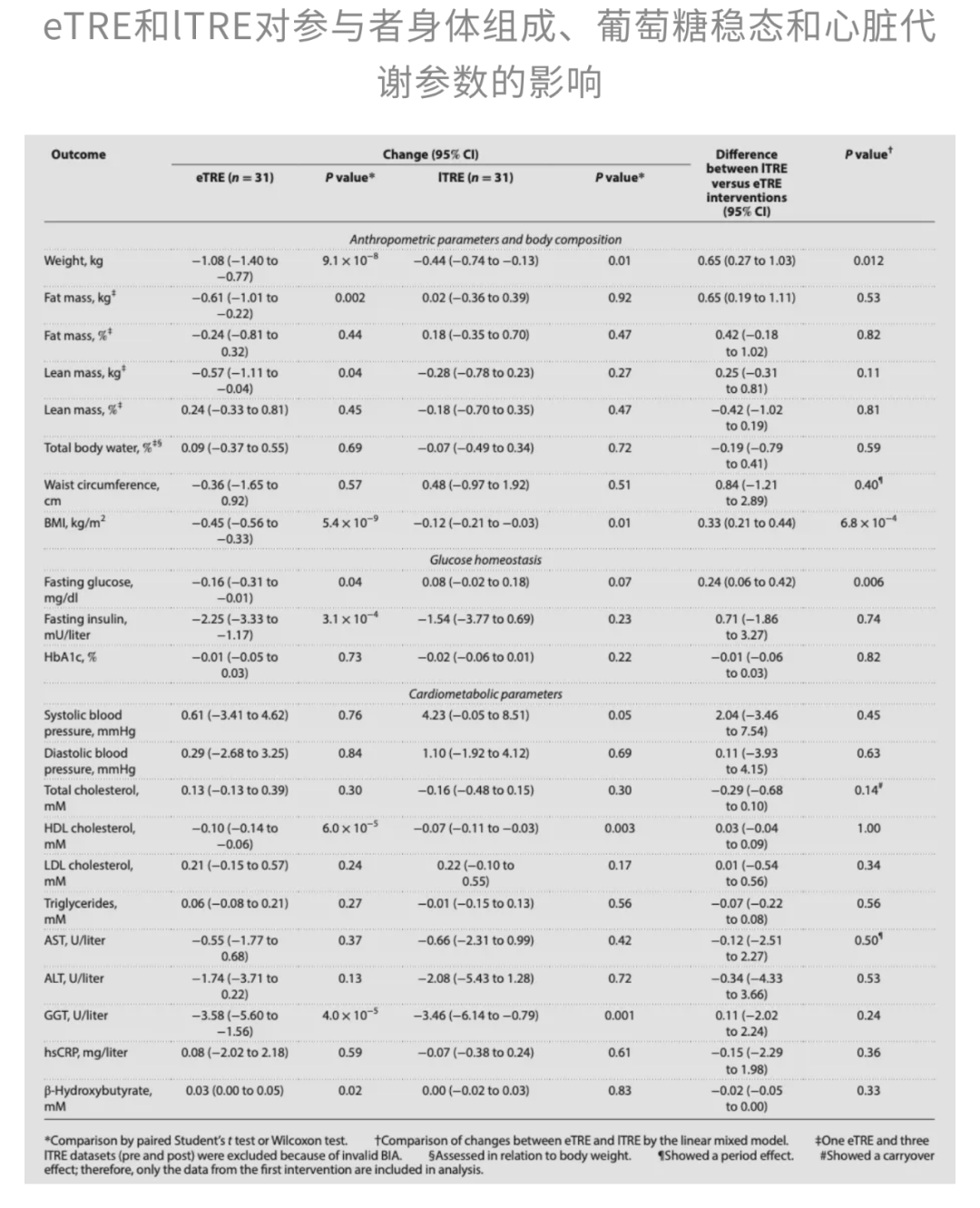 然而,研究中最核心的代谢指标——胰岛素敏感性,在两种限时进食模式下均未显示改善。无论是eTRE还是lTRE组的参与者,胰岛素敏感性的变化都非常有限,组间差异同样不显著。