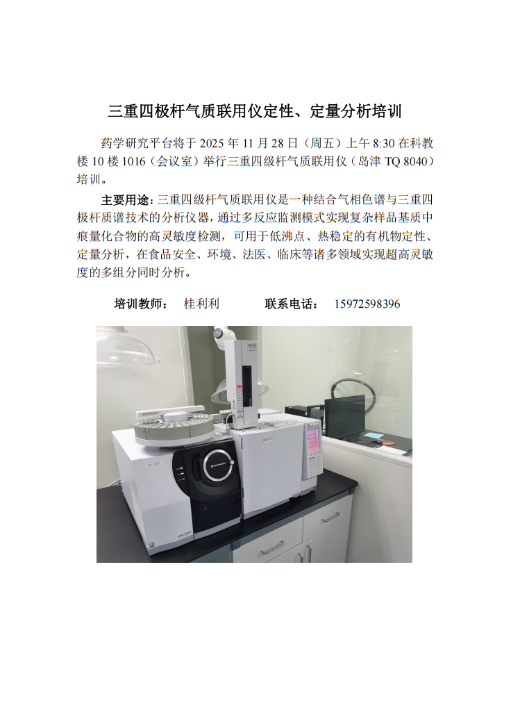 关于成人直播间 举行三重四级杆气质联用仪定性、定量分析培训的通知