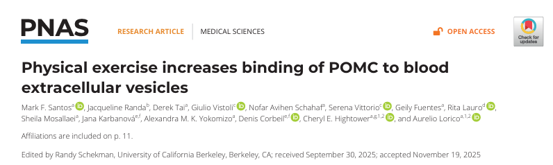 参考资料:[1]Santos MF, Randa J, Tai D, et al. Physical exercise increases binding of POMC to blood extracellular vesicles. Proc Natl Acad Sci U S A. 2025;122(51):e2525044122. doi:10.1073/pnas.2525044122