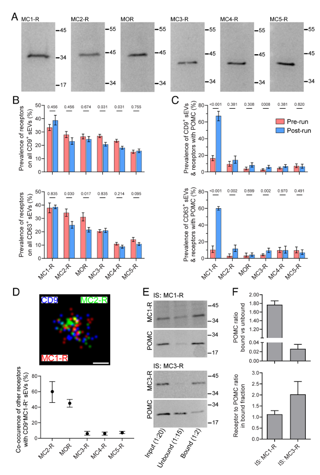 为探究POMC与sEVs结合的分子基础,研究人员检测发现sEVs表面表达多种POMC相关受体,包括MC1-R、MC2-R、MC3-R、MC4-R、MC5-R及μ阿片受体(MOR)。进一步的免疫共沉淀和超高分辨率显微镜分析证实,POMC优先与sEVs表面的MC1-R结合,其次是MC3-R,与其他受体的结合则极微弱。