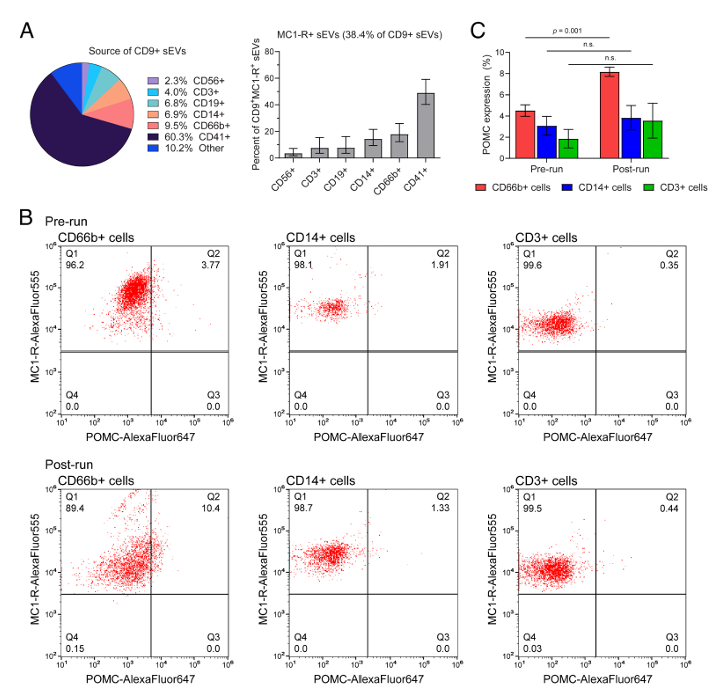 细胞来源分析显示,携带MC1-R的sEVs主要源自血小板/巨核细胞(60.3%)和白细胞(包括粒细胞、单核细胞、T细胞等),其中血小板/巨核细胞来源的sEVs占MC1-R阳性sEVs的49.0%,提示造血细胞是这类功能型sEVs的主要产生者。运动后,粒细胞与POMC的结合水平几乎翻倍,进一步佐证了免疫细胞在该调控通路中的作用。