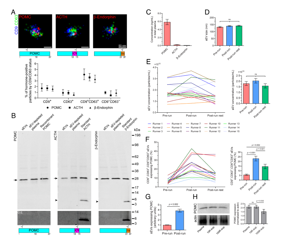 结果发现,血浆中未加工的全长POMC浓度远高于其成熟活性肽(如促肾上腺皮质激素、β内啡肽),且部分POMC可与sEVs结合,这些sEVs同时表达sEV标志物CD9或CD63,说明POMC并非仅以游离形式存在于循环中。