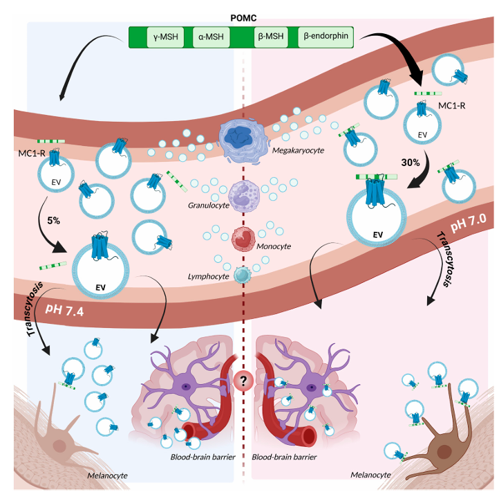 分子动力学模拟揭示,血液酸化会导致POMC中α-MSH结构域的组氨酸残基质子化,引发构象改变,使β-MSH结构域暴露,从而更易与sEVs表面的MC受体结合。这一构象变化具有pH依赖性,在酸性环境下更稳定,且结合后不易解离。