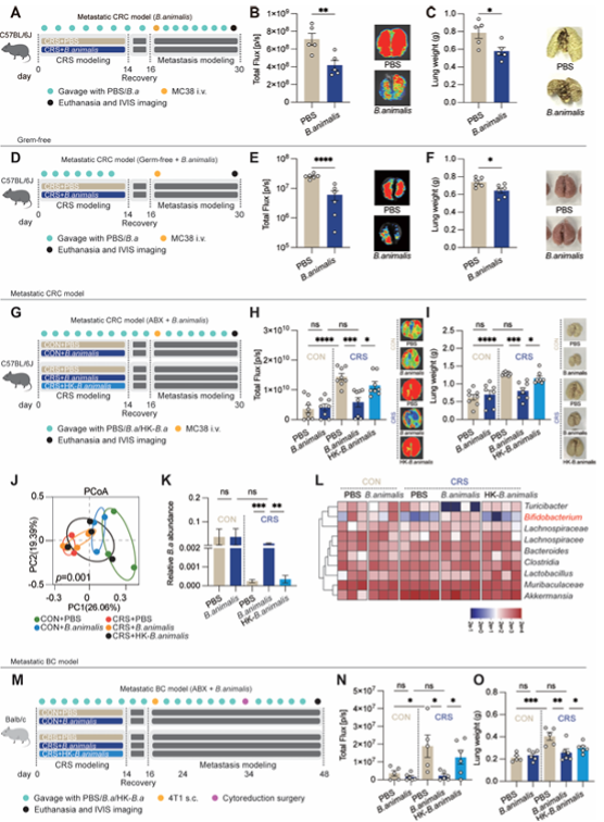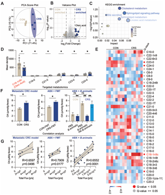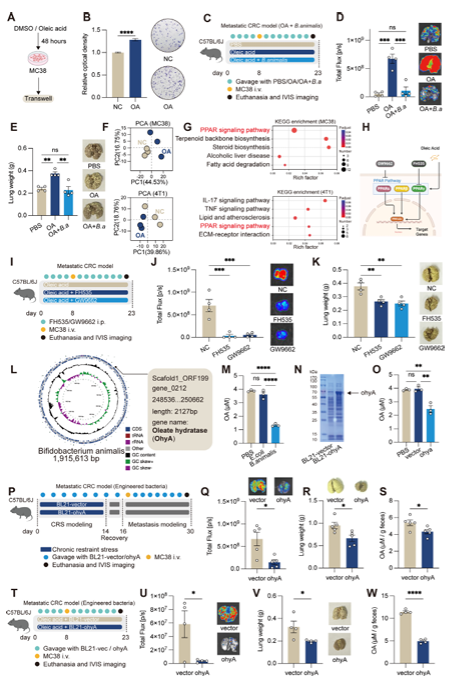 在结直肠癌患者队列中,研究者又发现了高度一致的证据:高压力评分的患者,粪便中动物双歧杆菌丰度和油酸水合酶基因表达更少,血液和粪便中油酸水平更高,且发生癌症转移的比例显著增加。这强力证实了该机制在人类疾病中的相关性。