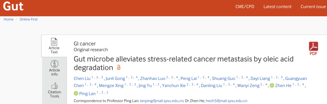 [1]Liu C, Gong J, Luo Z, Lai P, Guo S, Liang D, Chen G, Xing M, Yu J, Xie Y, Liu D, Zeng W, He Z, Lan P. Gut microbe alleviates stress-related cancer metastasis by oleic acid degradation. Gut. 2025 Nov 30:gutjnl-2025-335627. doi: 10.1136/gutjnl-2025-335627. Epub ahead of print. PMID: 41320324.