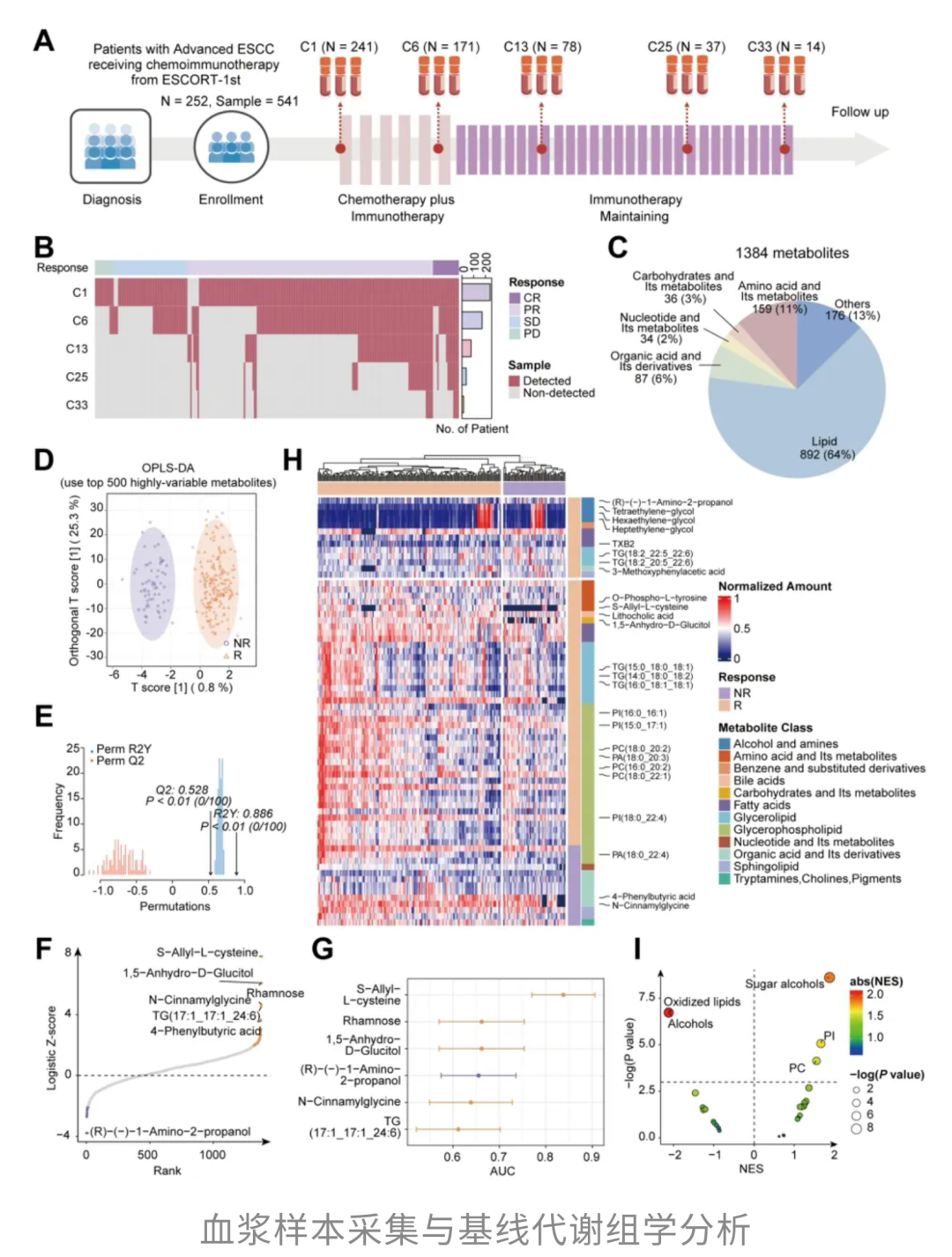 通过对这些样本进行代谢组学分析,他们发现,治疗过程中代谢物的变化,本身就是一张「实时疗效监测图」,能够反映他们对化疗联合免疫治疗的反应情况。随着治疗不断推进,鞘磷脂在疗效不佳/进展高风险患者的血浆中逐渐积累,而甘油磷脂水平在治疗有效患者中显著更高。