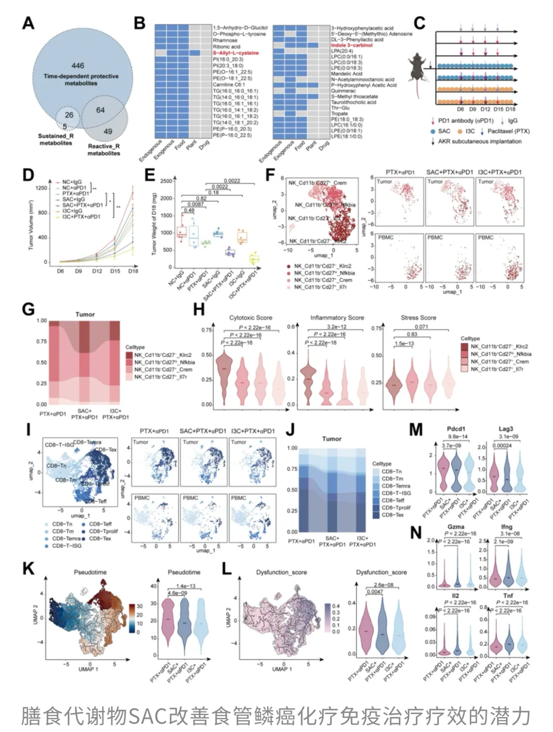 与此同时,CD8⁺T细胞也迎来了转机。在肿瘤微环境中,这些T细胞常常因为长期「作战」而逐渐进入耗竭状态。但SAC的加入,让原本「疲惫」的T细胞「满血复活」,降低了PD-1、LAG-3等抑制信号的表达,提高了IFN-γ、IL-2、TNF等免疫激活因子的水平,从而显著了增强现有化疗联合免疫治疗的效果。