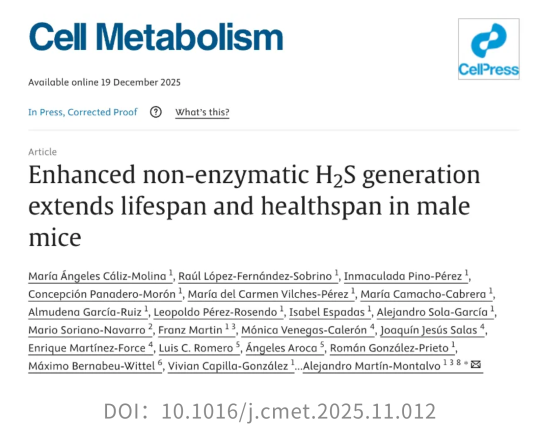 [2]Cáliz-Molina MÁ, López-Fernández-Sobrino R, Pino-Pérez I, Panadero-Morón C, Vilches-Pérez MDC, Camacho-Cabrera M, García-Ruiz A, Pérez-Rosendo L, Espadas I, Sola-García A, Soriano-Navarro M, Martin F, Venegas-Calerón M, Salas JJ, Martínez-Force E, Romero LC, Aroca Á, González-Prieto R, Bernabeu-Wittel M, Capilla-González V, Hine C, Martín-Montalvo A. Enhanced non-enzymatic H2S generation extends lifespan and healthspan in male mice. Cell Metab. 2025 Dec 19:S1550-4131(25)00526-1. doi: 10.1016/j.cmet.2025.11.012. Epub ahead of print. PMID: 41421349.
