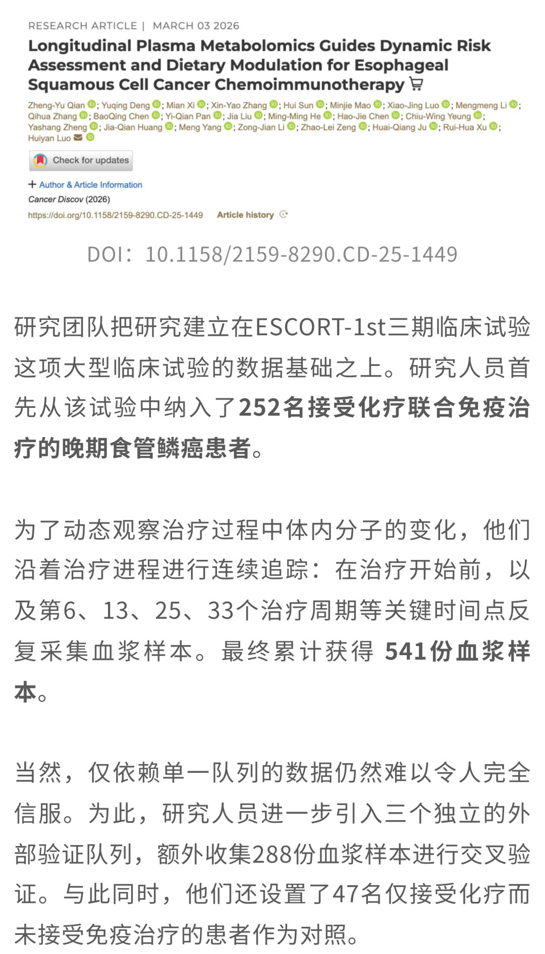 [1]Qian ZY, Deng Y, Xi M, Zhang XY, Sun H, Mao M, Luo XJ, Li M, Zhang Q, Chen B, Pan YQ, Liu J, He MM, Chen HJ, Yeung CW, Zheng Y, Huang JQ, Yang M, Li ZJ, Zeng ZL, Ju HQ, Xu RH, Luo H. Longitudinal Plasma Metabolomics Guides Dynamic Risk Assessment and Dietary Modulation for Esophageal Squamous Cell Cancer Chemoimmunotherapy. Cancer Discov. 2026 Mar 3. doi: 10.1158/2159-8290.CD-25-1449. Epub ahead of print. PMID: 41771153.